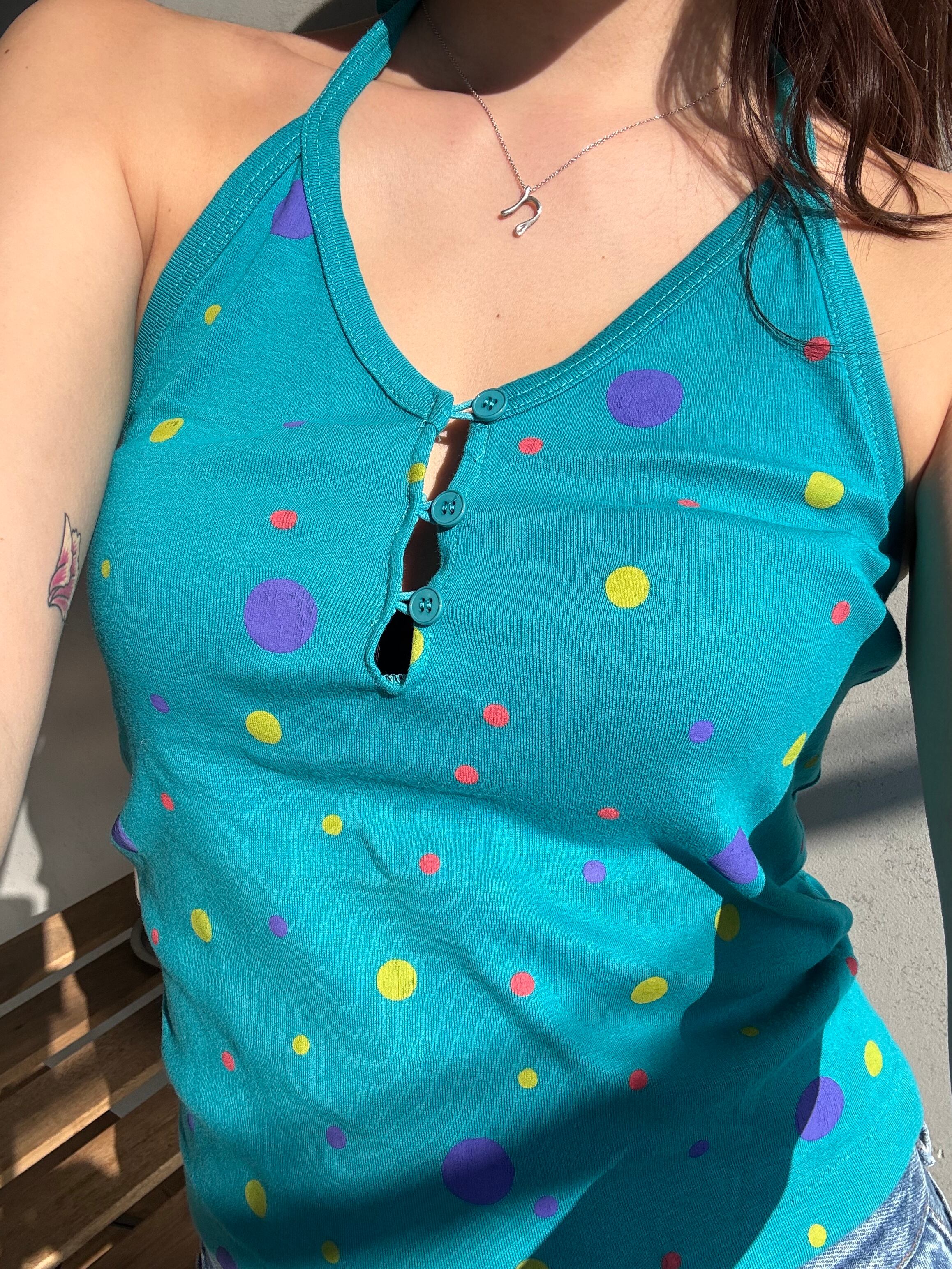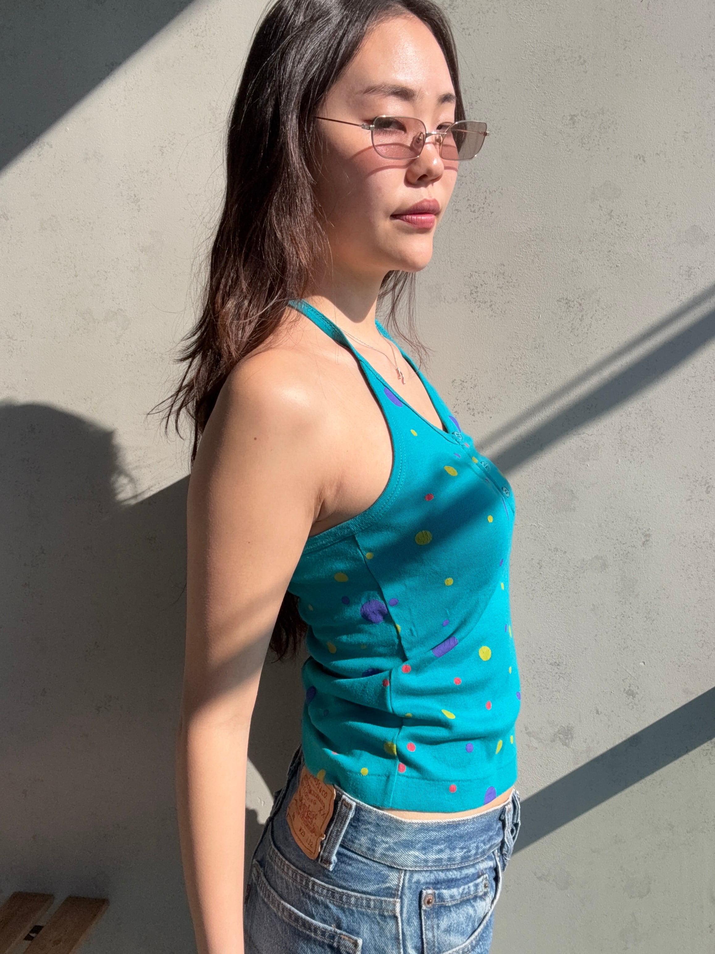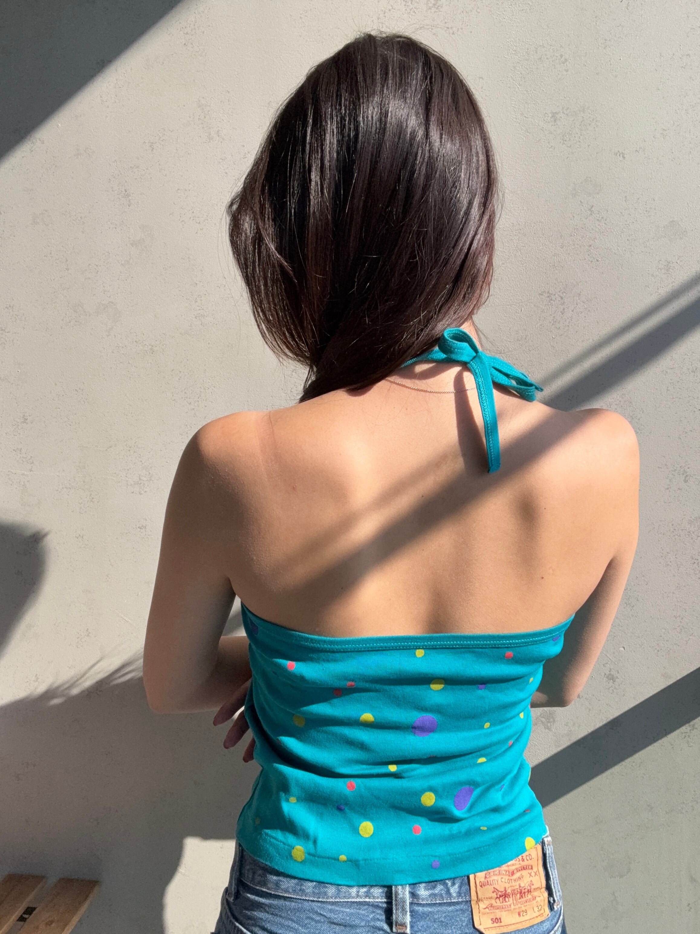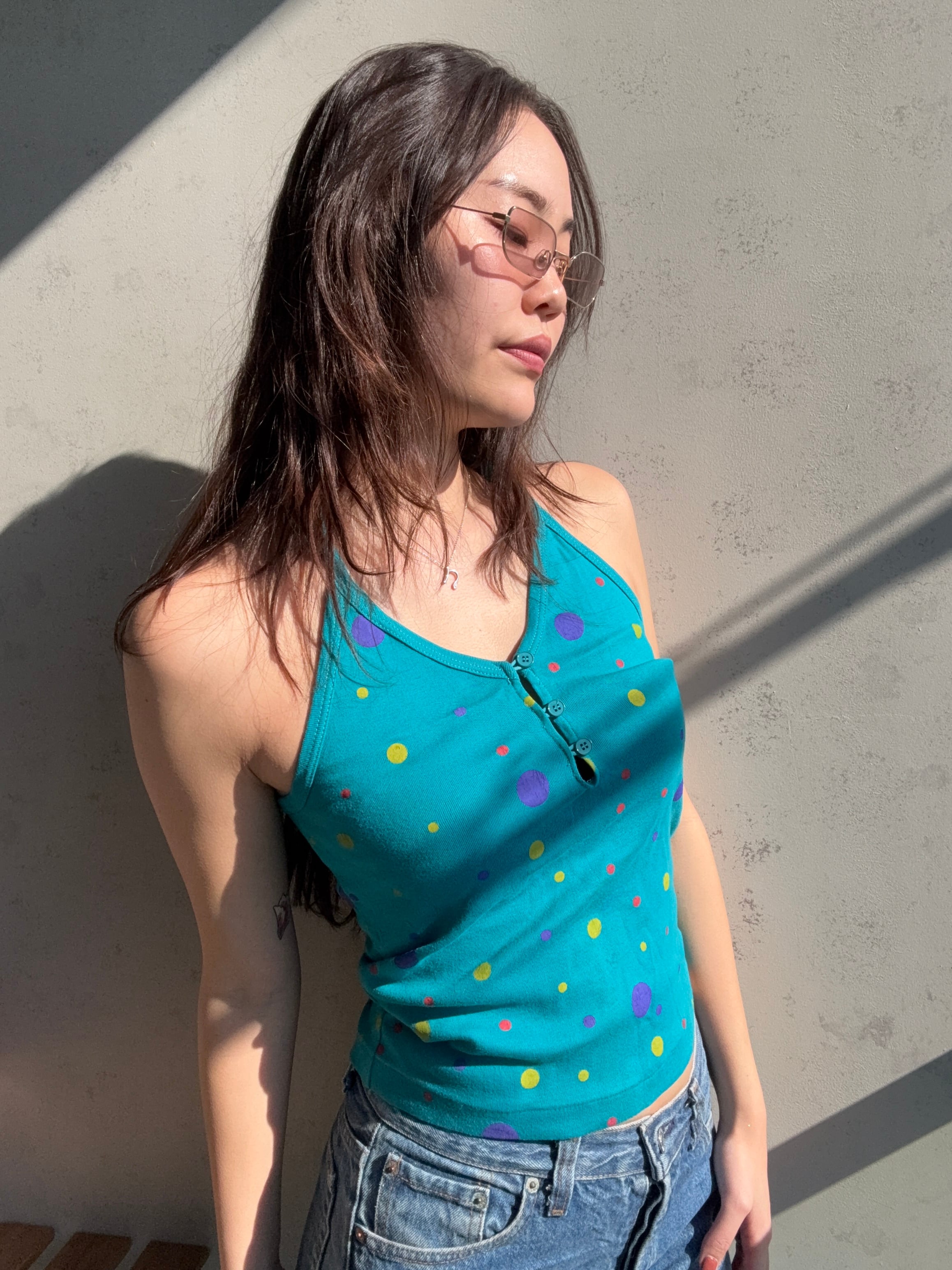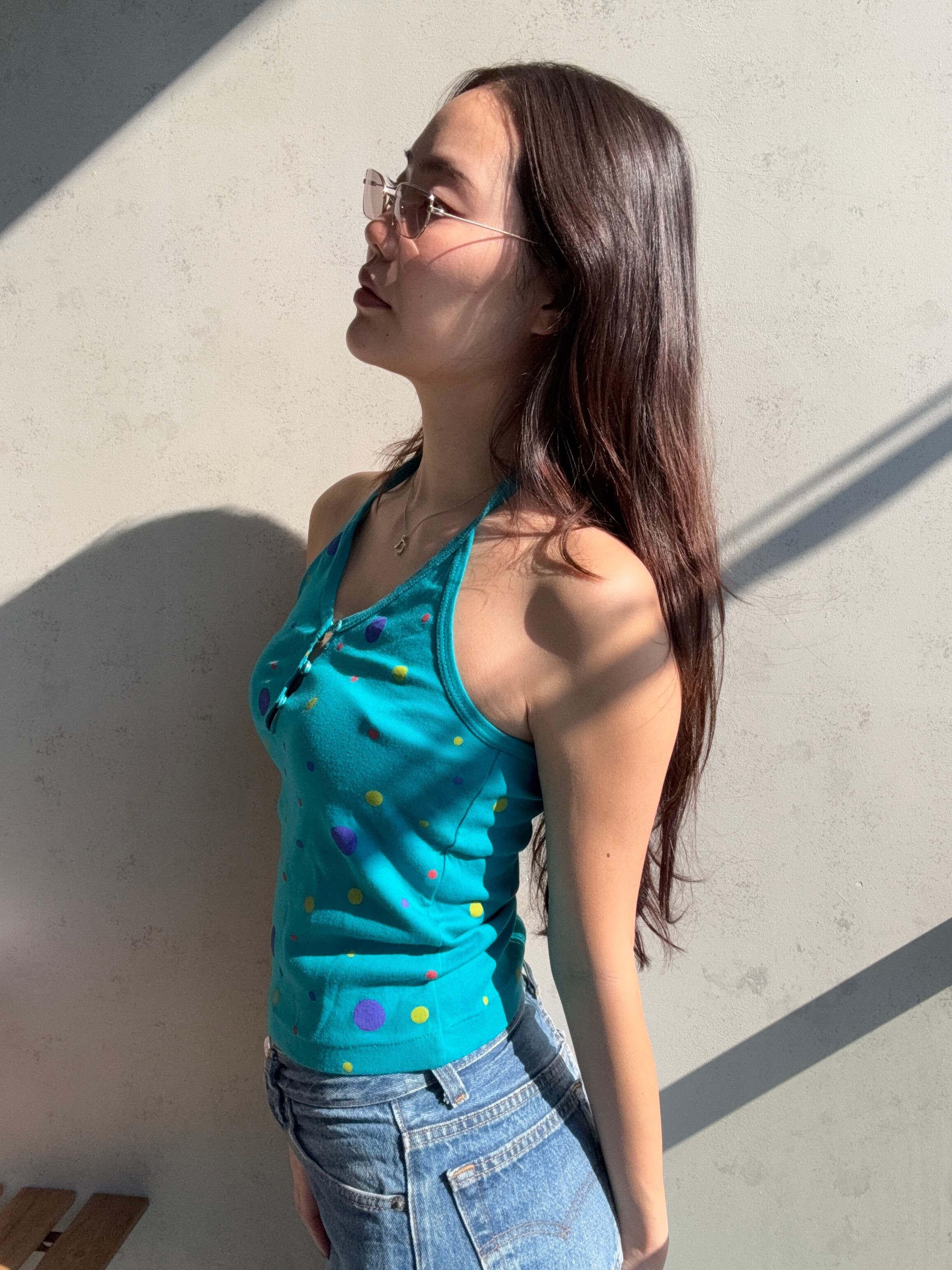 ホルターネックなのにボタンが付いているところも個性的で好き✨