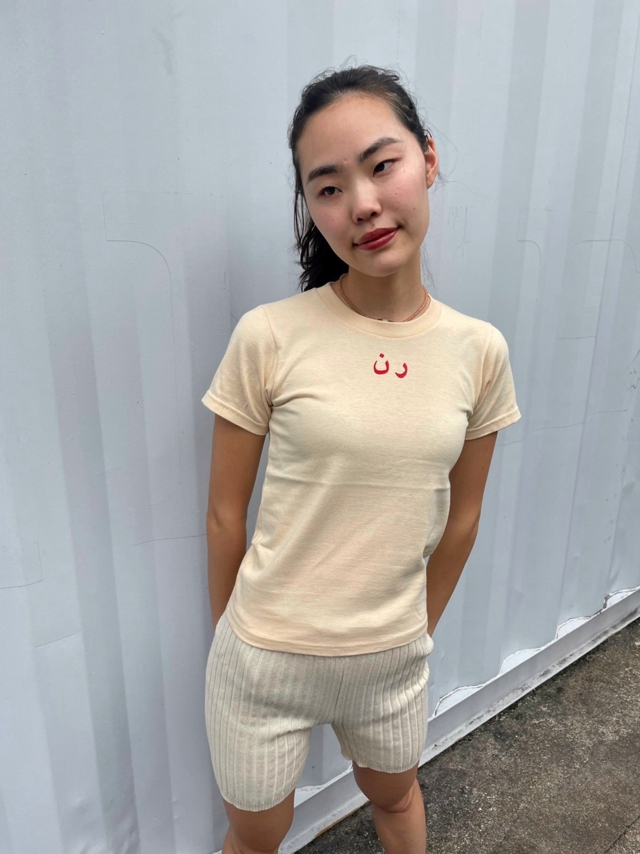 フロントに小さくアラビア語がハンドプリントされているよ!その後ろになんともカワイイオリジナルのタグを付けちゃいました〜♡♡