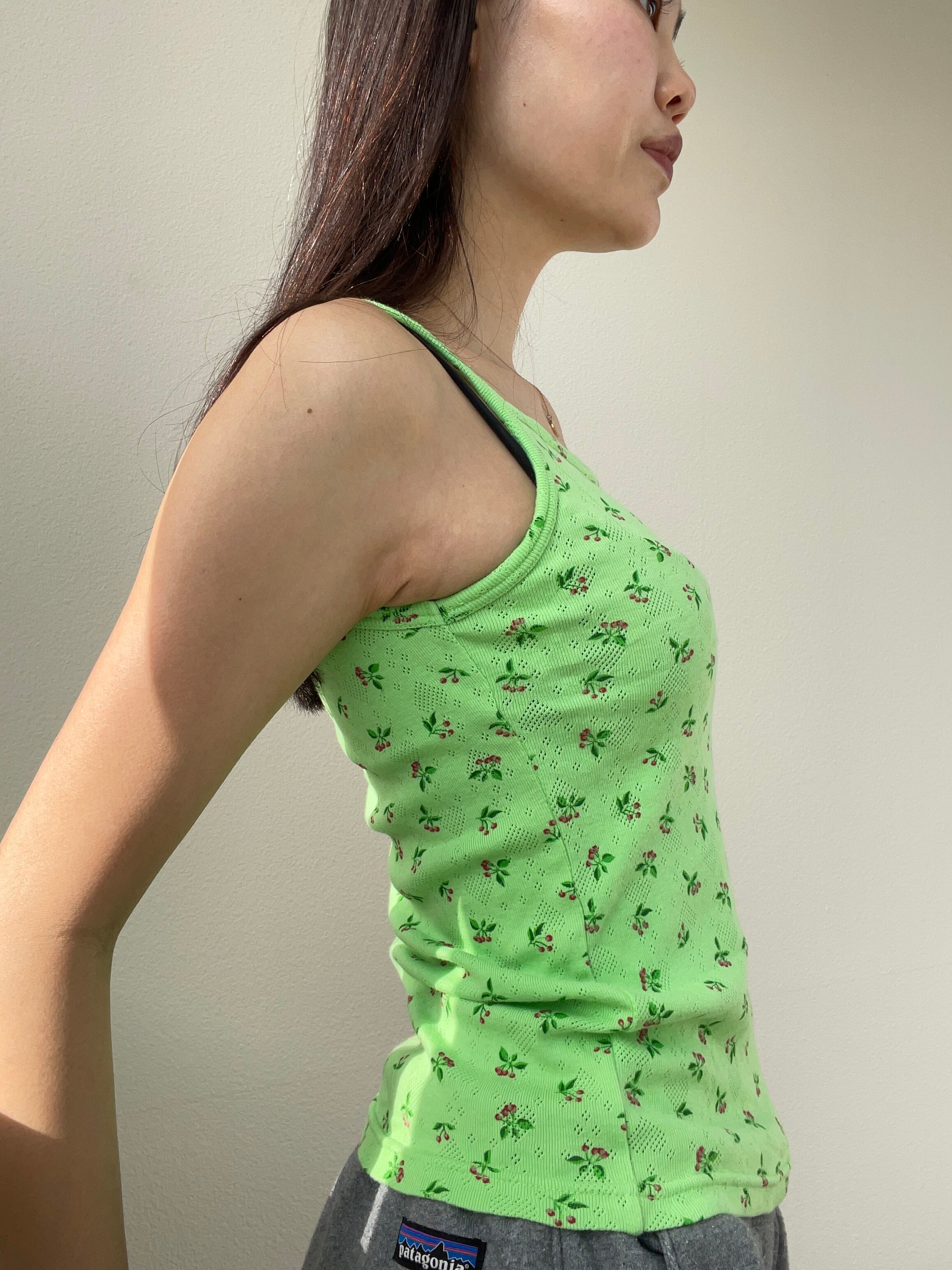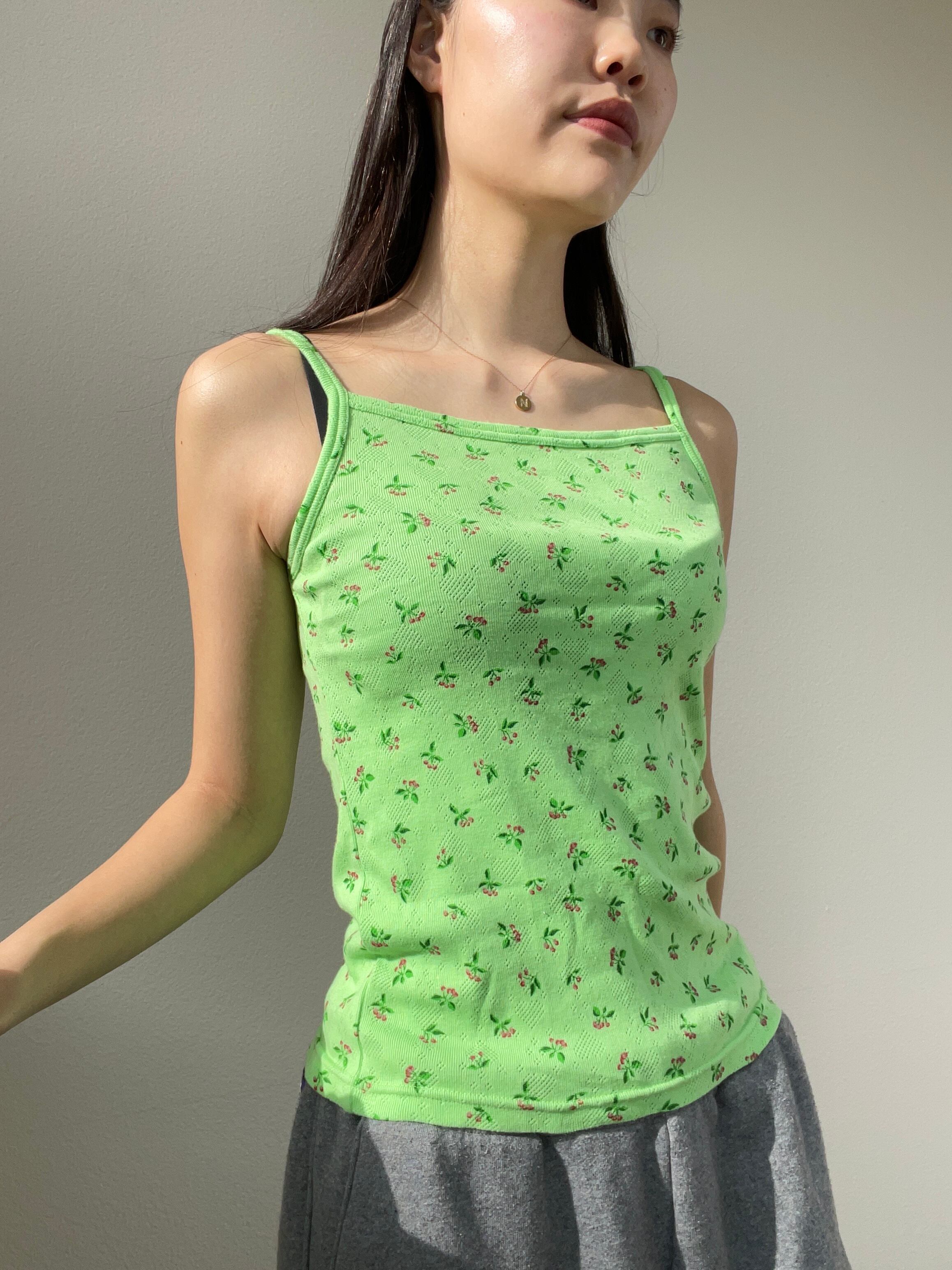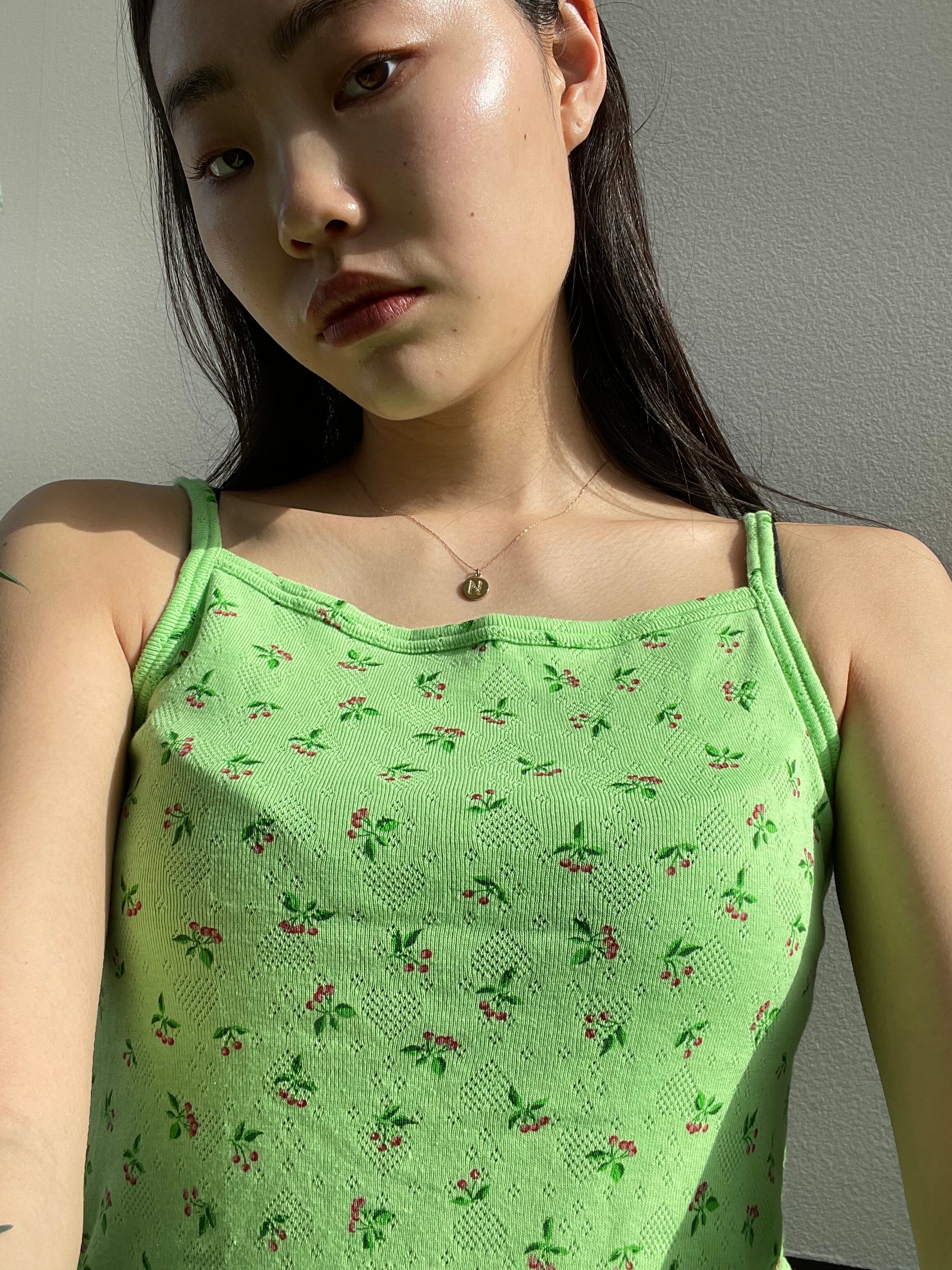 夏が近づくにつれ、気分も明るくなる❤️そんな季節にぴったりな「トリッキーチェリー」。鮮やかな緑色のキャミソールは、さくらんぼのデザインがとっても可愛らしい一枚です。