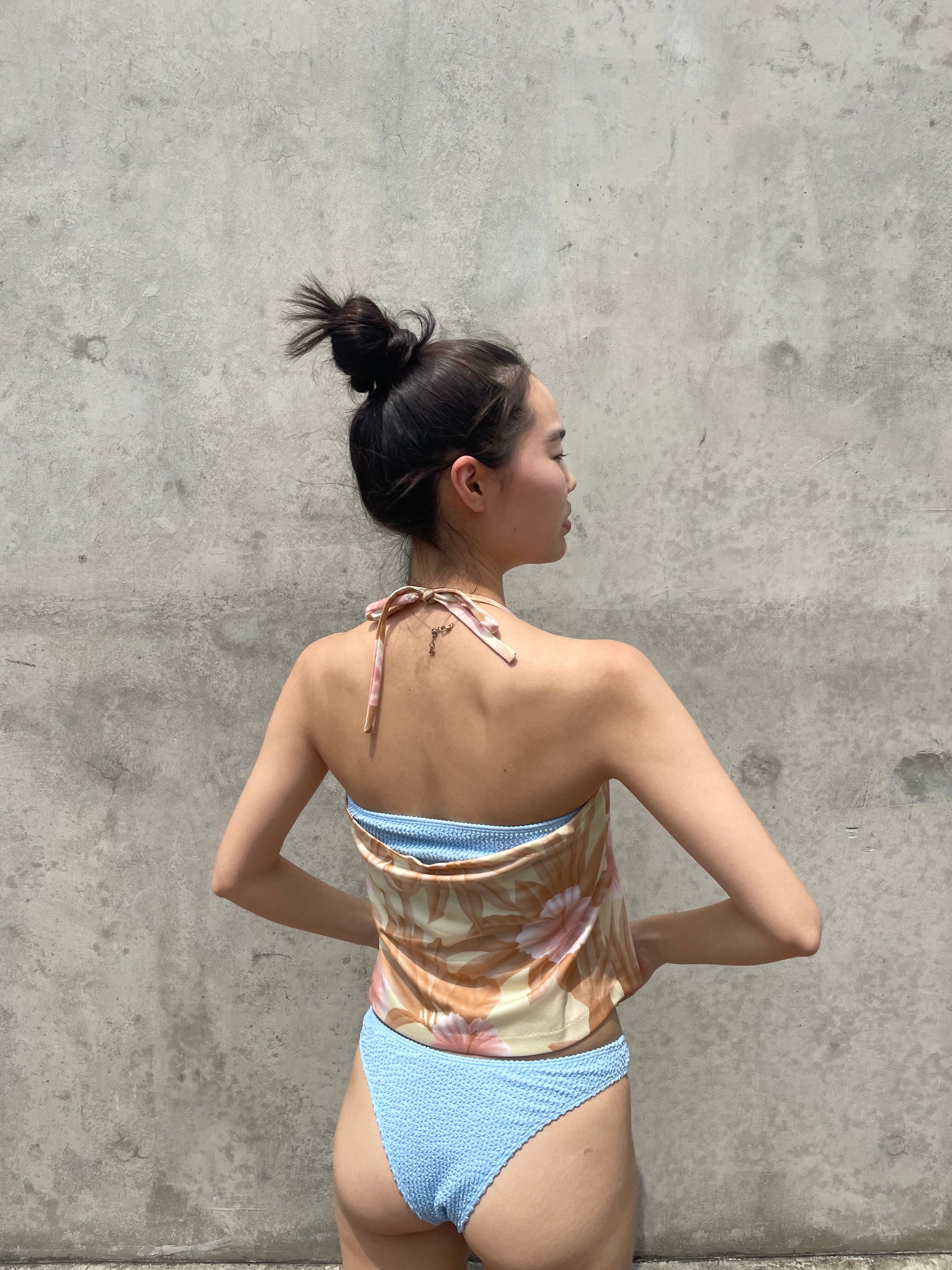 背中の開きが涼しげな、ホルターネックのトップス「creamy pink」。クリーム色のハイビスカスがどこか懐かしさを感じさせます❤️