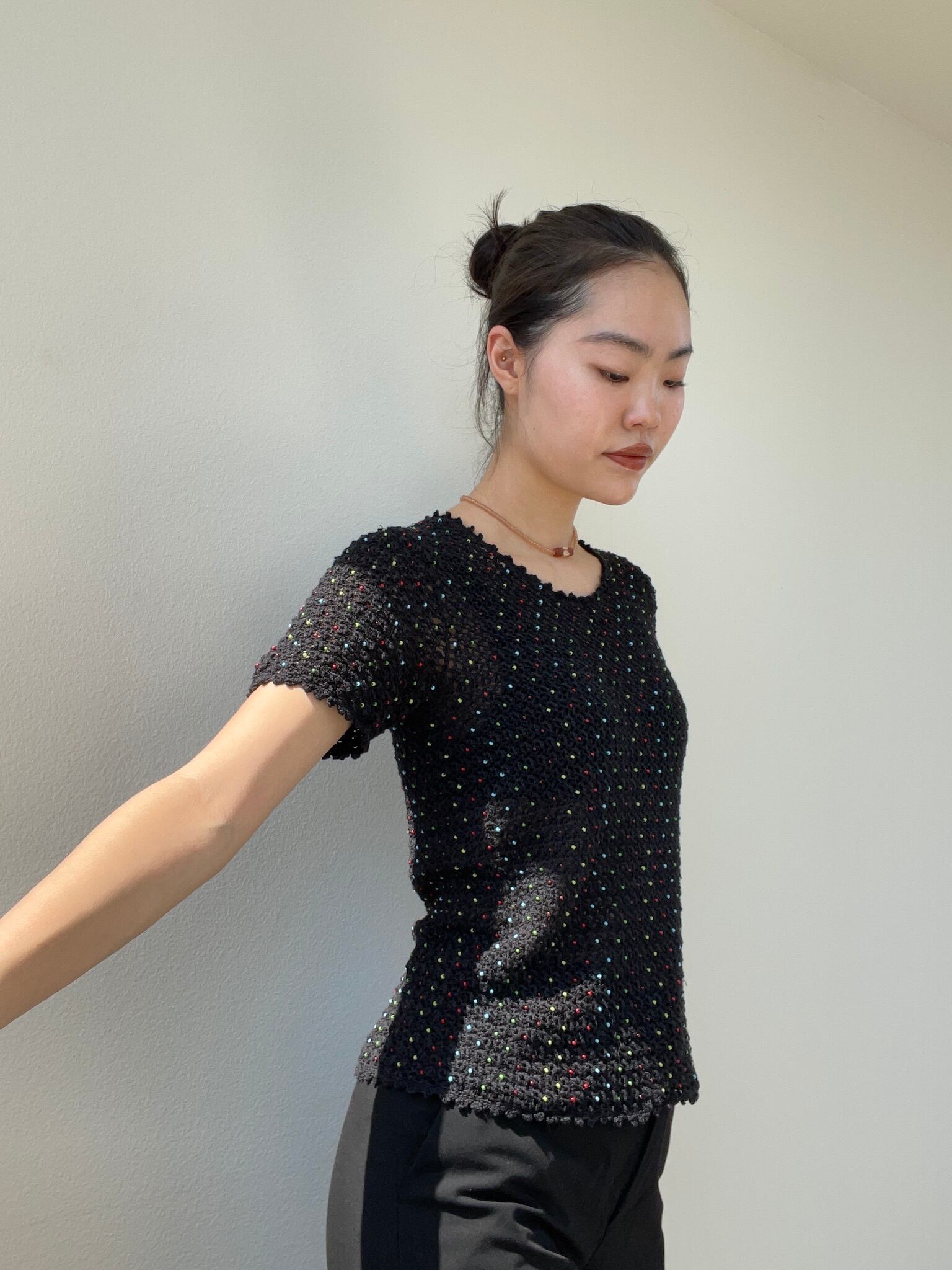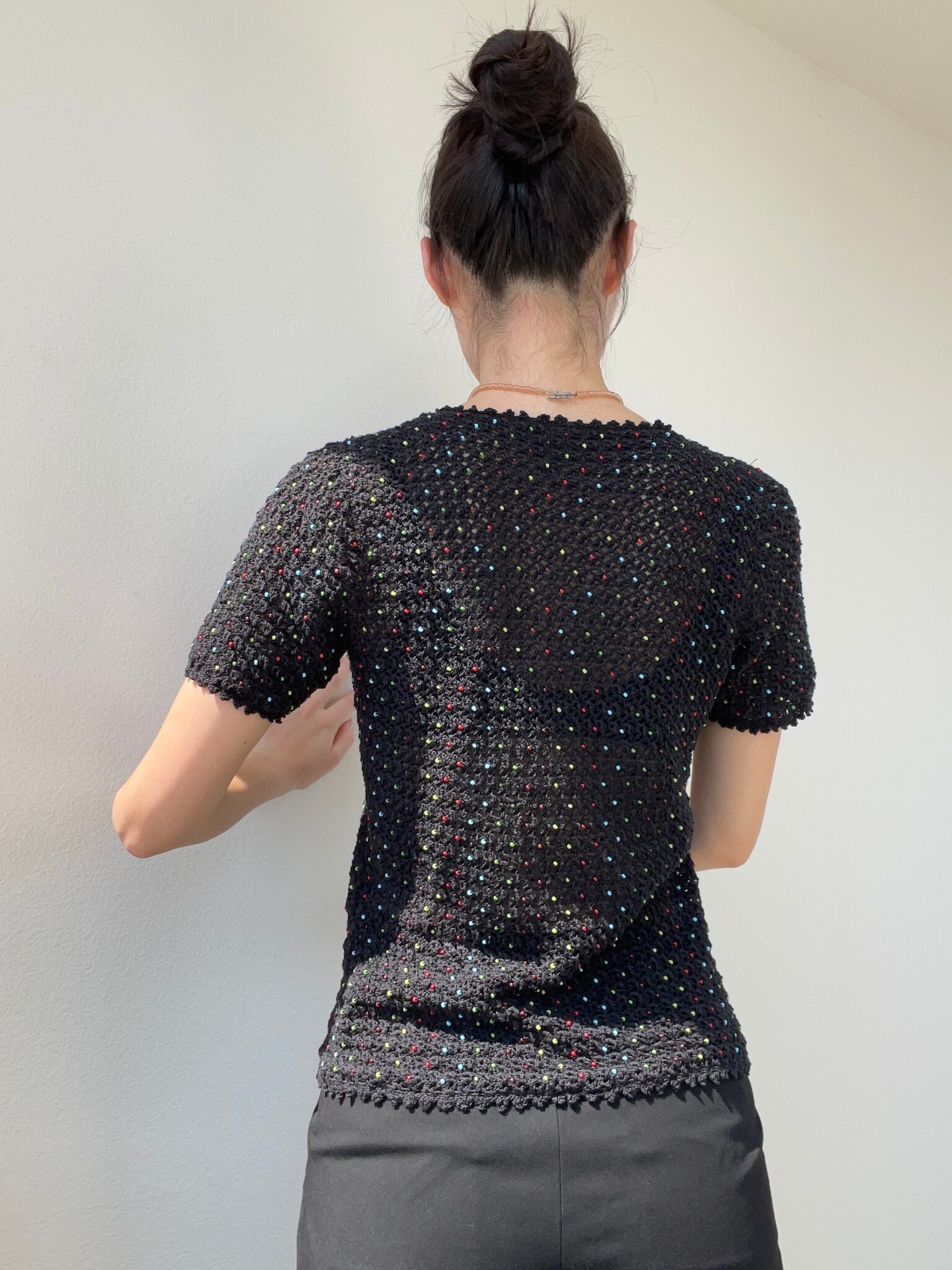 カラフルなビーズが映える黒のサマーニット!ちょいと透け感があるのもいいですね
