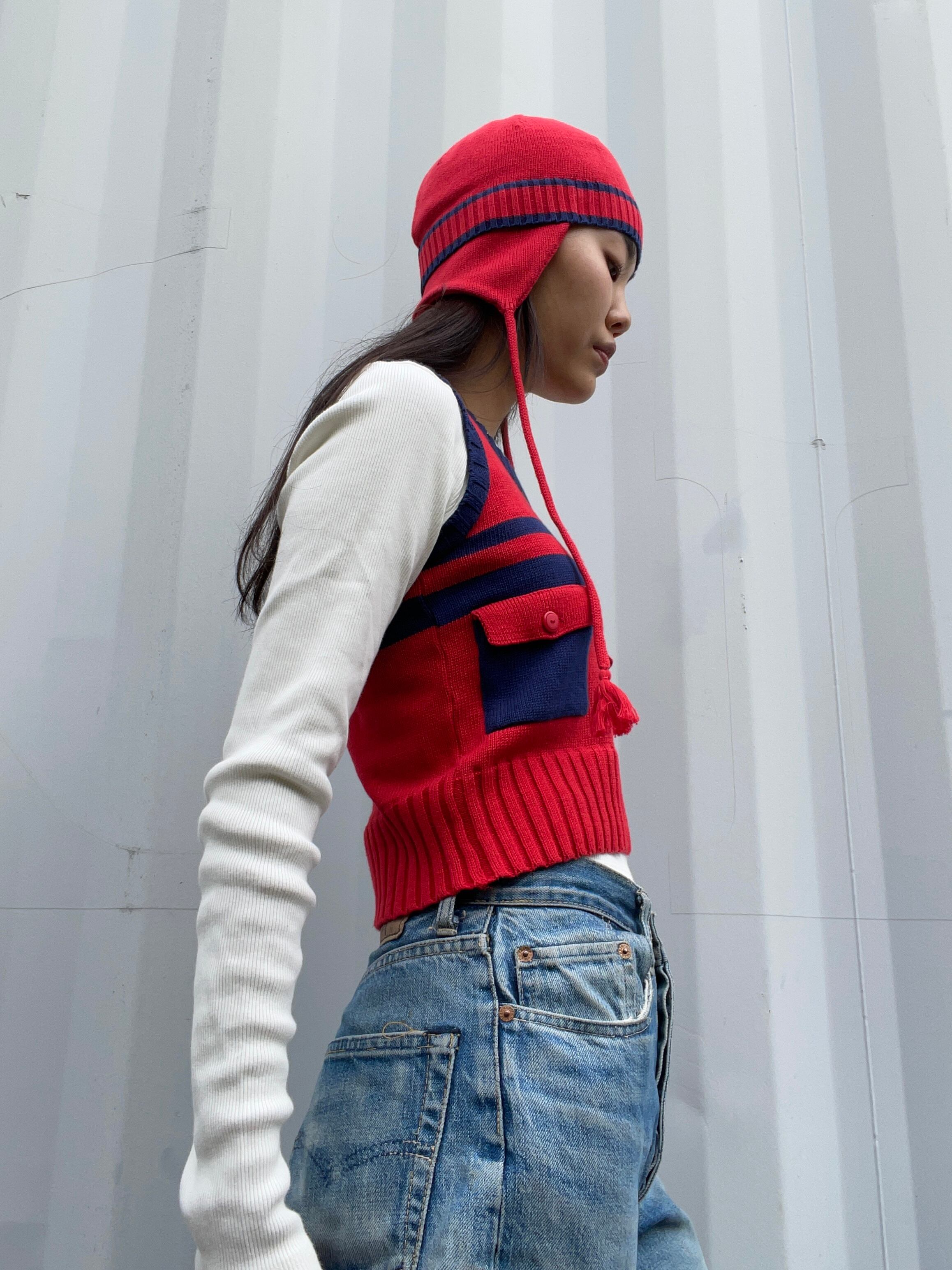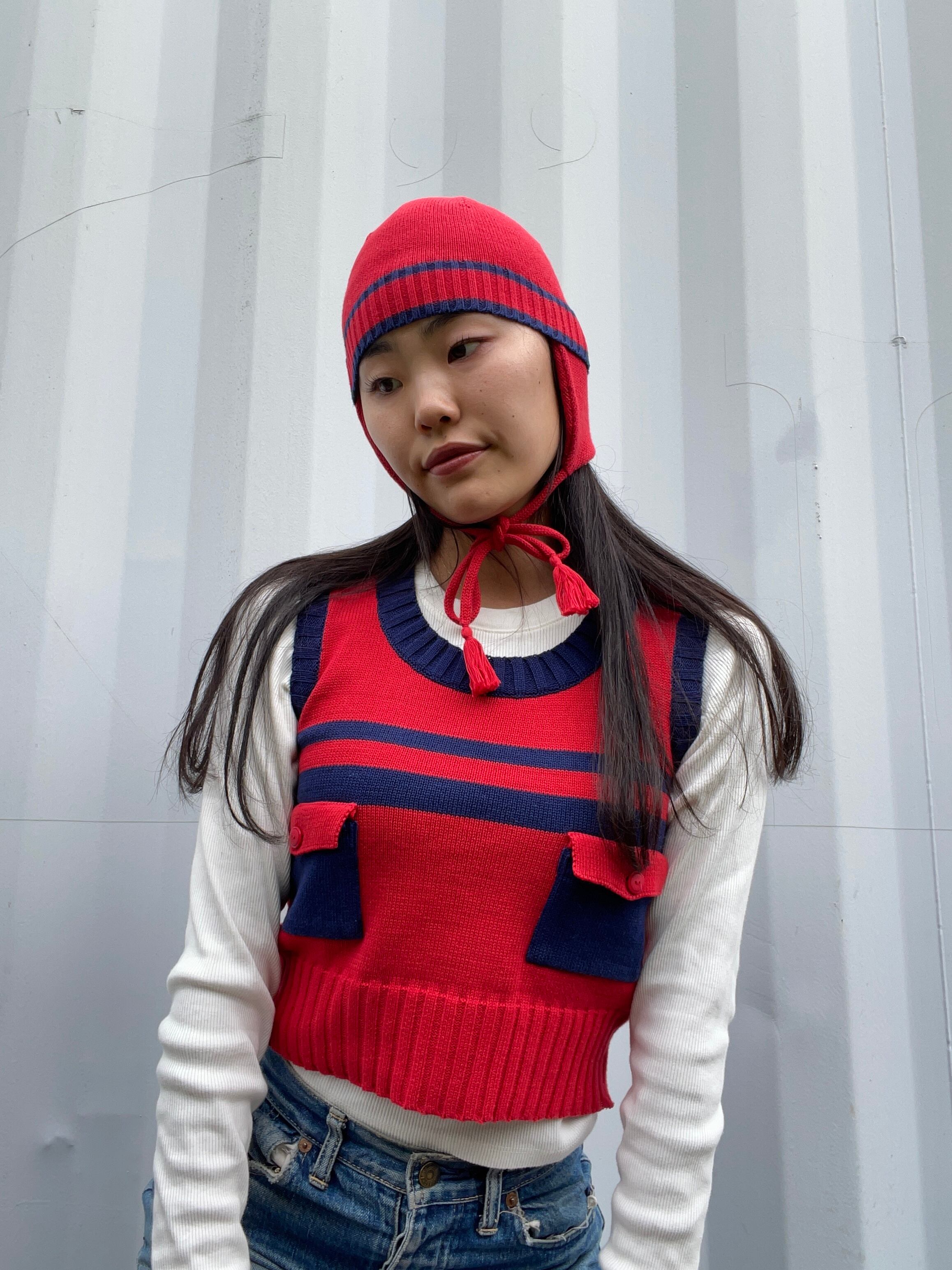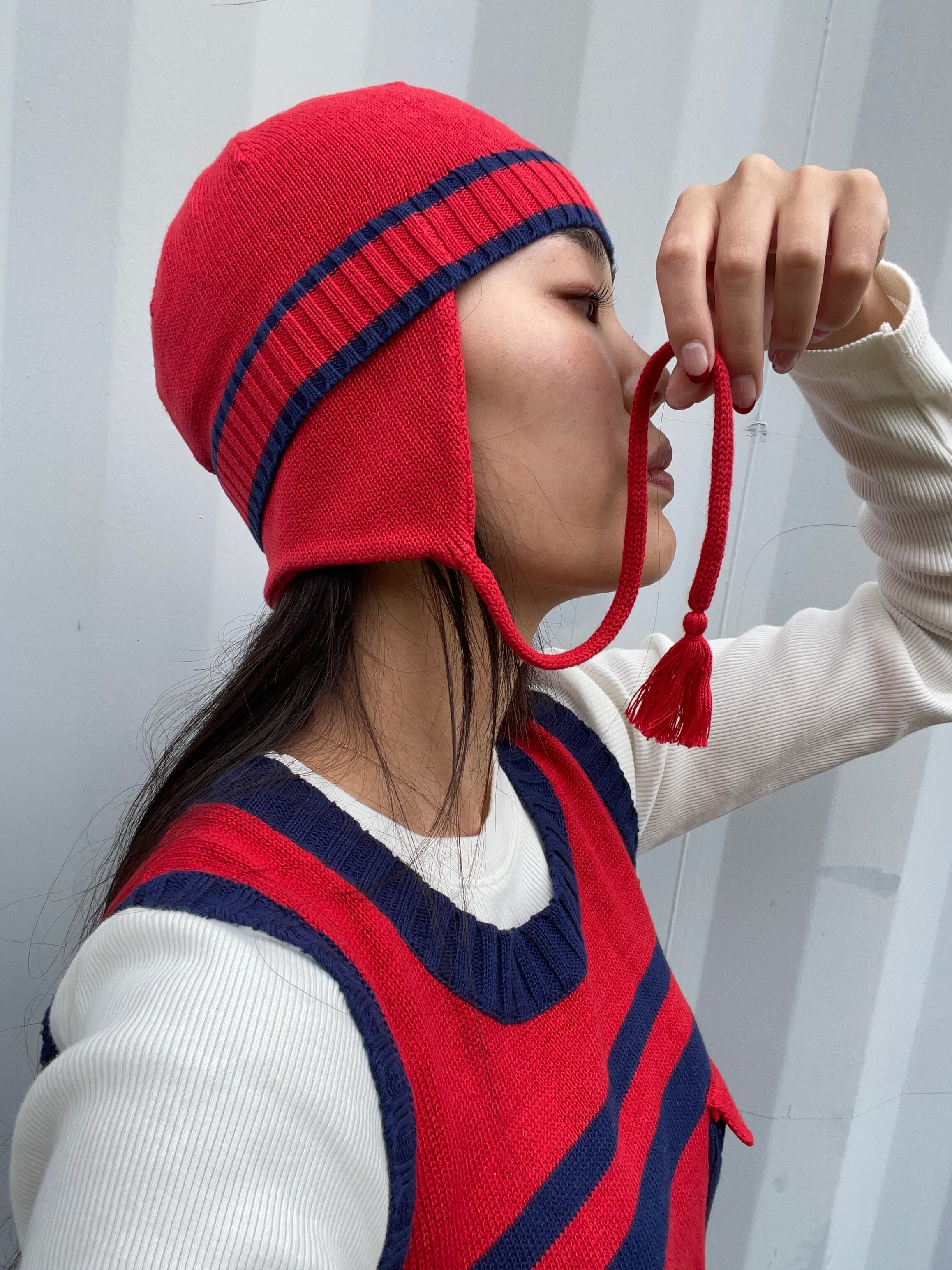 ニット帽は、耳当て付きだけどボリューミーすぎないコンパクトなサイズ感がいい!紐をリボン結びでキュッとするの好きなのよね✨